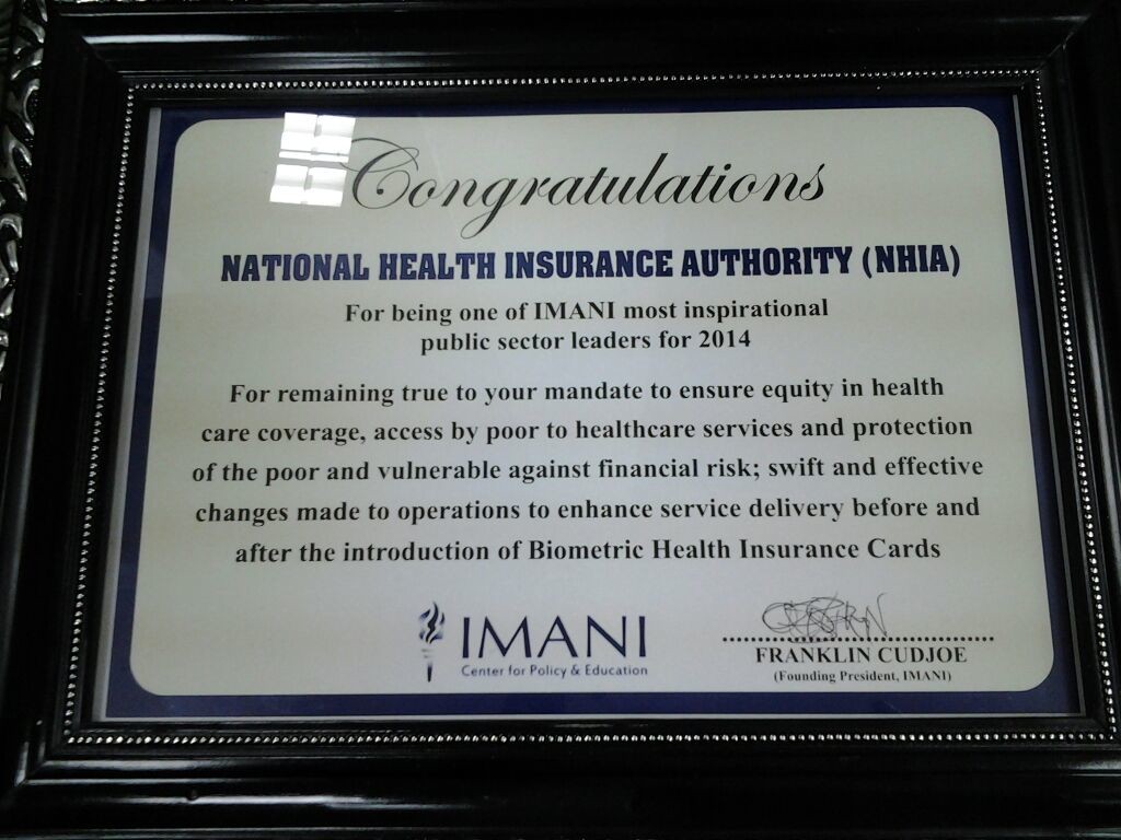 The IMANI Centre for Policy & Education cited the NHIA for its 2014 top award at a ceremony at Alisa Hotel, Ridge, in Accra on the 27th of November, 2014.
